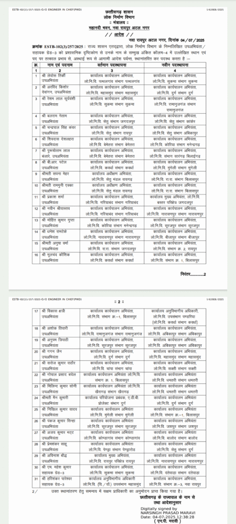 This order has been issued by Deputy Secretary of Public Works Department NP Maravi. The transferred officers have been posted with new responsibilities in various districts of the state.